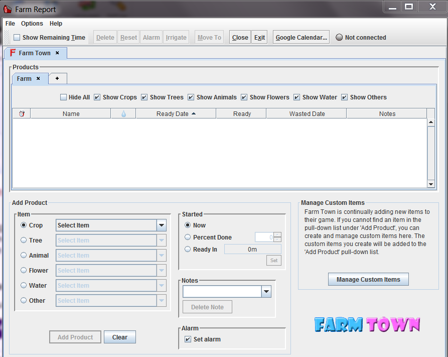 Farm Report is a free alarm program to be used in conjunction with Farm Town. It will help you keep track of the items on your farm. You can see, at a glance, when each of your items will be ready, and when they will go to waste.